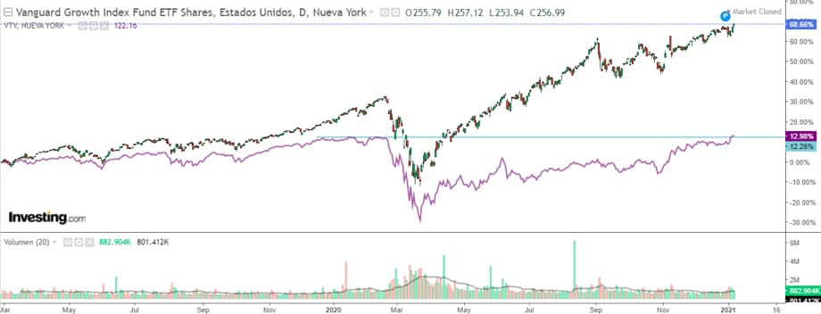 La diferencia entre las acciones de crecimiento (VUG) versus las de valor (VTV) es enorme y precisamente se ha disparado después de la pandemia.